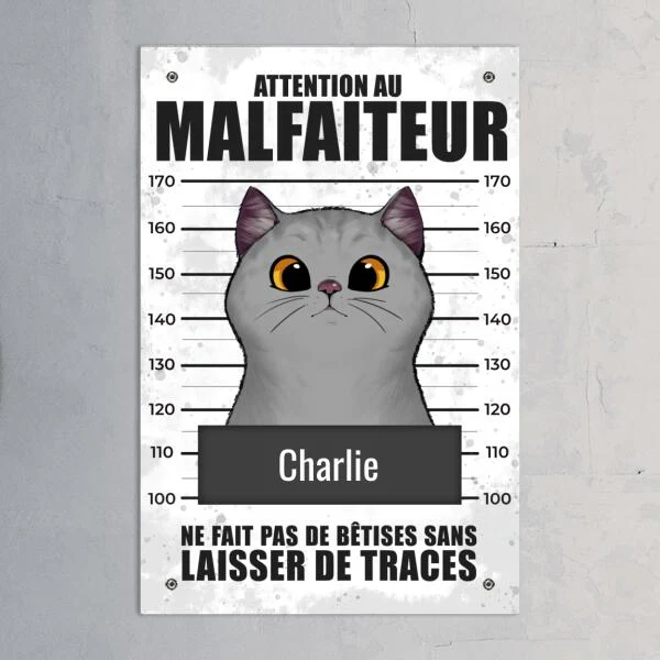 Notre « Malfaiteur - Plaque de porte personnalisée » attire tous les regards et offre un accueil unique à votre maison. Vous pouvez commander les plaques de porte personnalisées au format 20 x 15 cm ou 30 x 20 cm avec 4 trous de fixation inclus. Elles sont fabriquées en Europe.